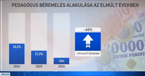Emelkedik a tanárok bére: 10%-os fizetésemelés lép életbe, amelynek köszönhetően a pedagógusok átlagbére eléri a 930.000 forintot – számolt be róla az M1 Híradó.